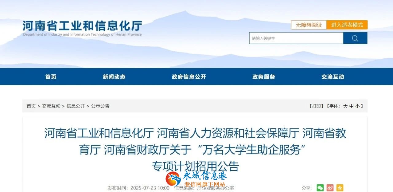 2025 7 2 3 日河南省工業(yè)和信息化廳、河南省人力資源和社會保障廳、河南省教育廳、河南省財(cái)政廳聯(lián)合發(fā)布招用公告。